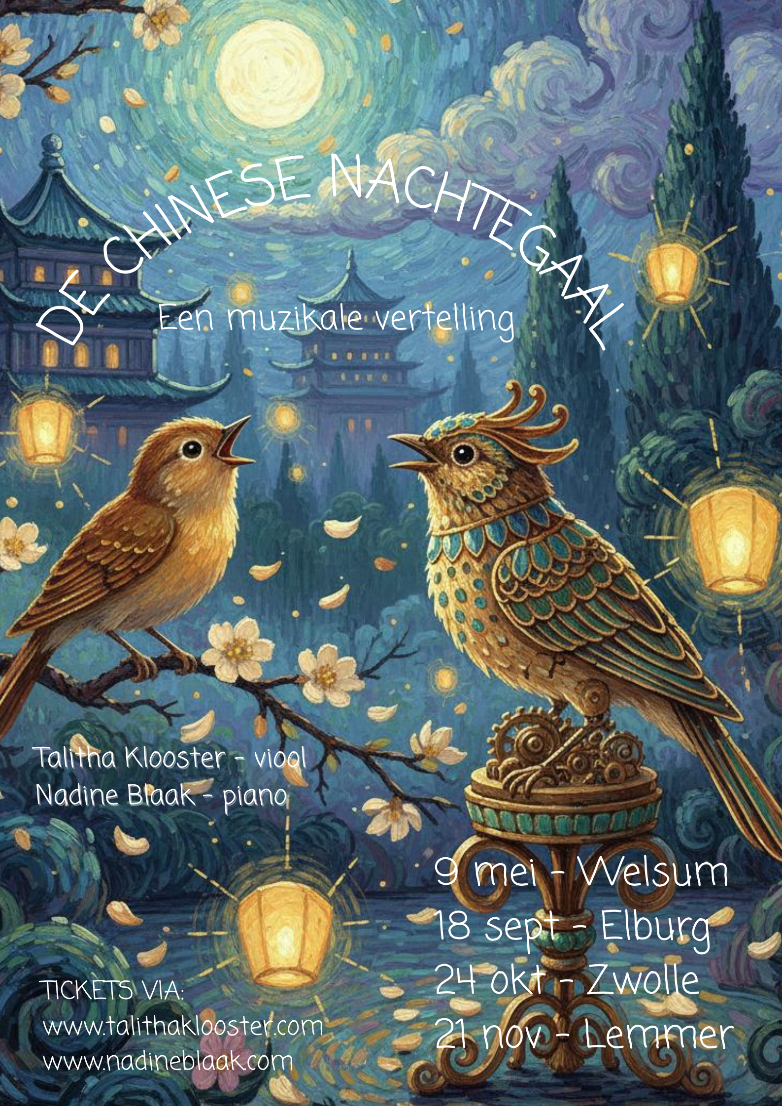 Met 'De Chinese Nachtegaal: een muzikale vertelling' geeft Duo Fiore een frisse, muzikale take op het gelijknamige sprookje: een concert waarin het verhaal van Hans Christian Andersen tot leven komt, afgewisseld met iconische muziek vol fantasie. Denk aan de dromerige klanken van Scheherazade, de avonturen van Peer Gynt, de verhalende sfeer van Märchenbilder en de magie van Cinderella. Verhalen en muziek vloeien naadloos in elkaar over—een luisterervaring die je meeneemt naar een wereld vol verbeelding.